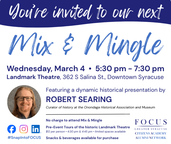 Join FOCUS’ Citizens Academy Alumni Network for an evening of conversation, connection, and civic engagement at the historic Landmark Theatre! This Mix & Mingle features a historical presentation by Robert Searing, Curator of History at the Onondaga Historical Association, exploring the Landmark Theatre’s history and its role in the community. Open to all, the evening welcomes Citizens Academy graduates, FOCUS supporters, and anyone new to FOCUS! Feel free to bring a friend! Enjoy networking, conversation, and connection while supporting FOCUS through a fundraiser and friend-raiser!