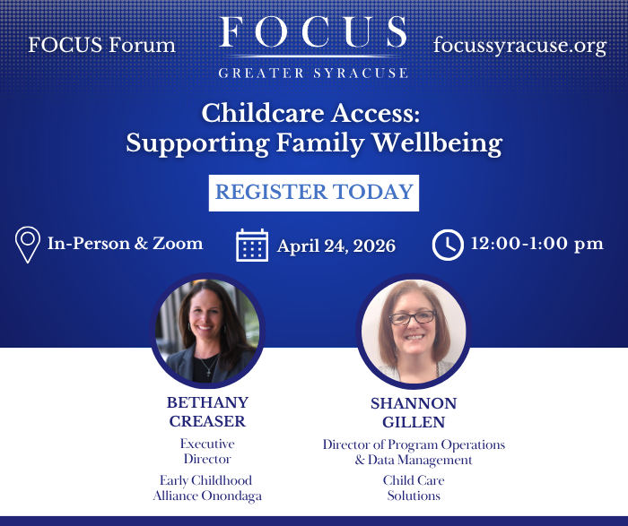 Join FOCUS for a hybrid public forum where panelists will explore what it takes to ensure young children in our community are healthy, supported, and ready to thrive. Panelists from the Early Childhood Alliance of Onondaga, which works to build a coordinated system of early childhood supports across Onondaga County, and Child Care Solutions, a local nonprofit that helps families find quality care and connects them to financial assistance and other resources, will share what they see working with local families every day, what resources are available, and what still needs to change.